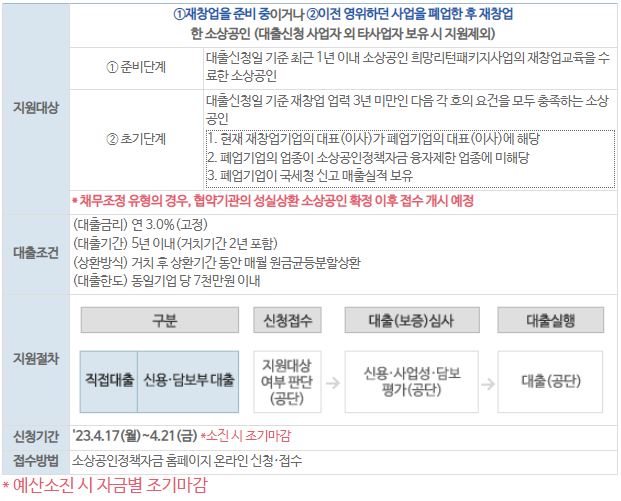 2023년 4월부터 재창업 또는 채무조정 성실이행을 통해 재도약과 경영정상화를 도모하는 소상공인을 위해 재도전특별자금을 지원합니다. 예산소진 시 자금별 조기마감 예정이니 서둘러 신청하세요!