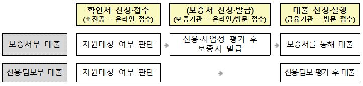 - 신용보증서(지역신용보증재단)를 담보로 대출 신청하는 소상공인은 보증기관과 사전 보증상담을 통해 보증가능 한도 확인 후 신청, 접수 바랍니다.